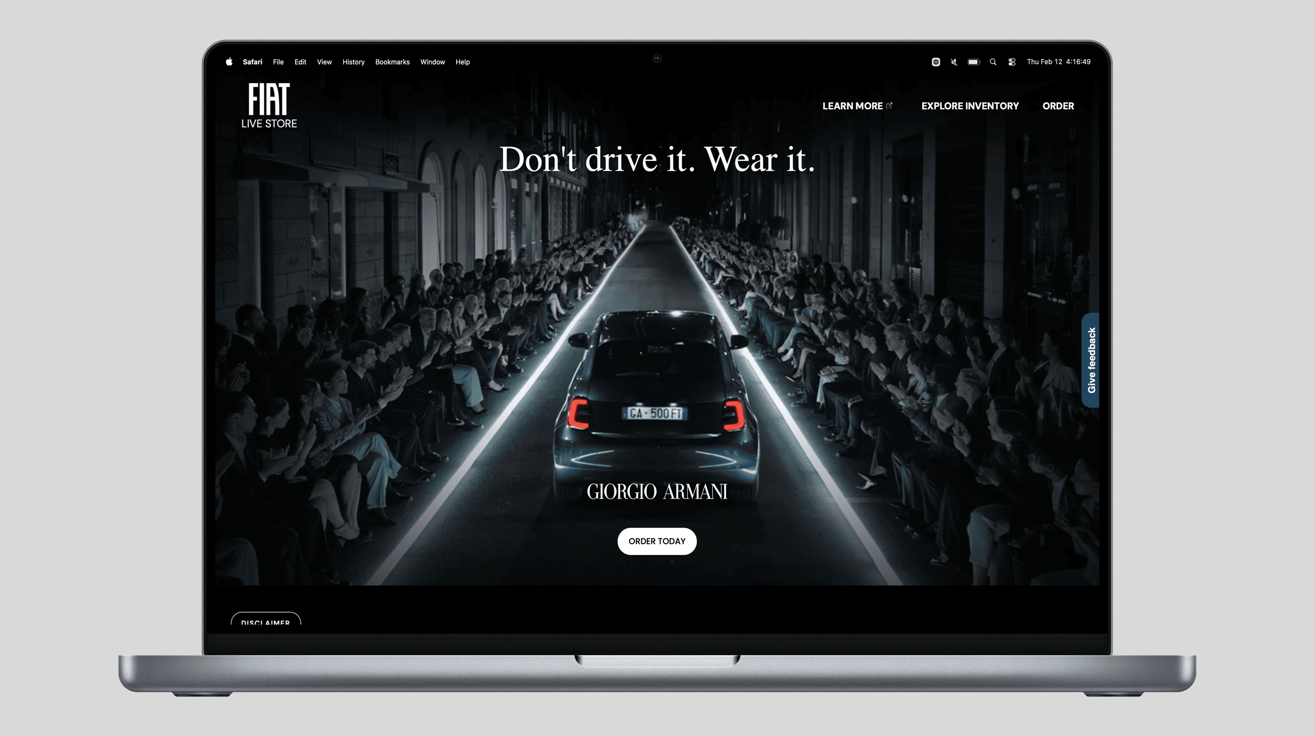 Rather than going to Fiat's competitors, I catalogued the landing pages of Giorgio Armani's direct competitors: Louis Vuitton, Gucci, and others. I noticed a clear formula: big type, big product placement, and NO buttons. What better way to create exclusivity than to remove your primary CTA! Alright, I had officially landed on a design concept. But, how do you wear a car?