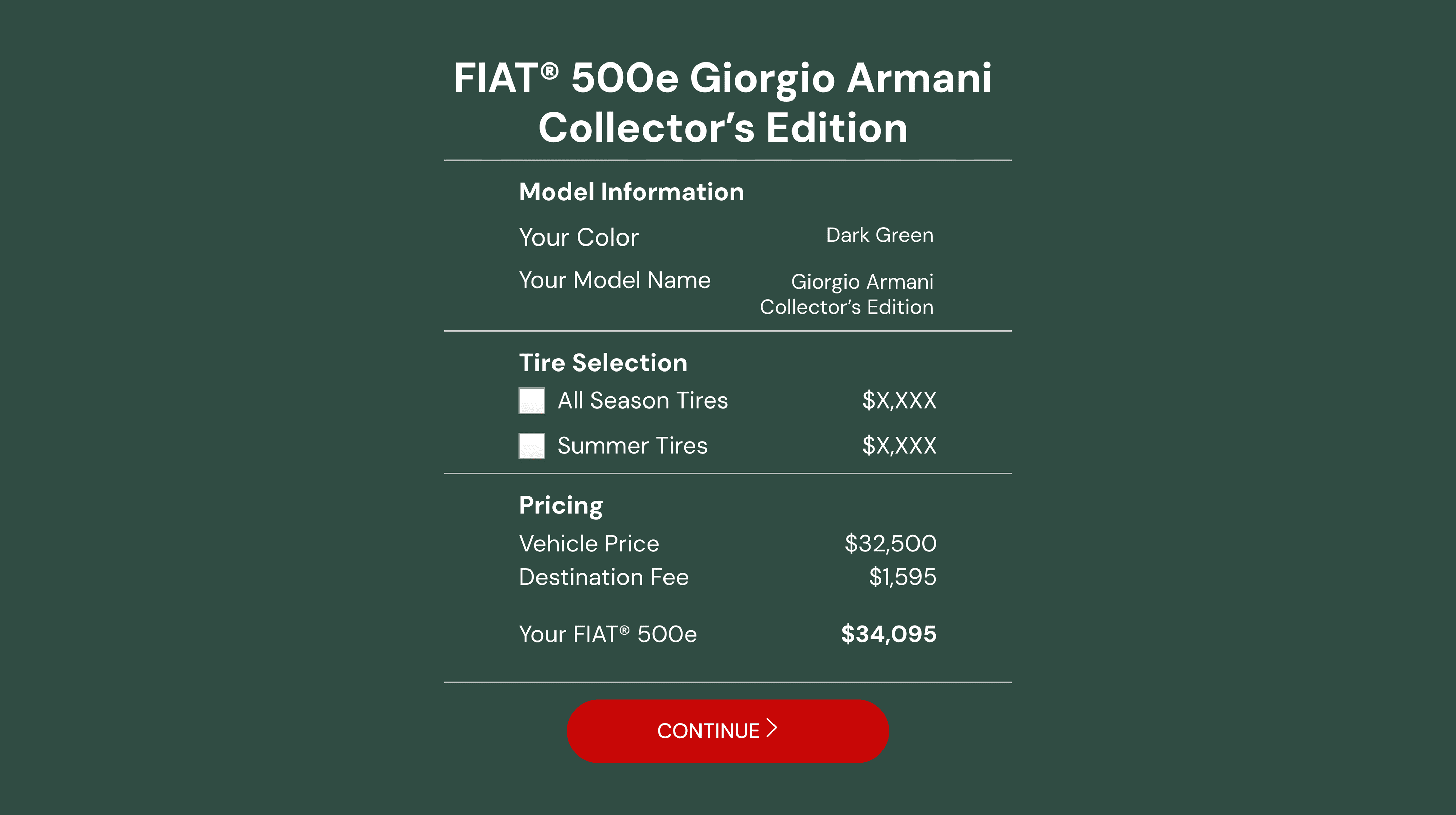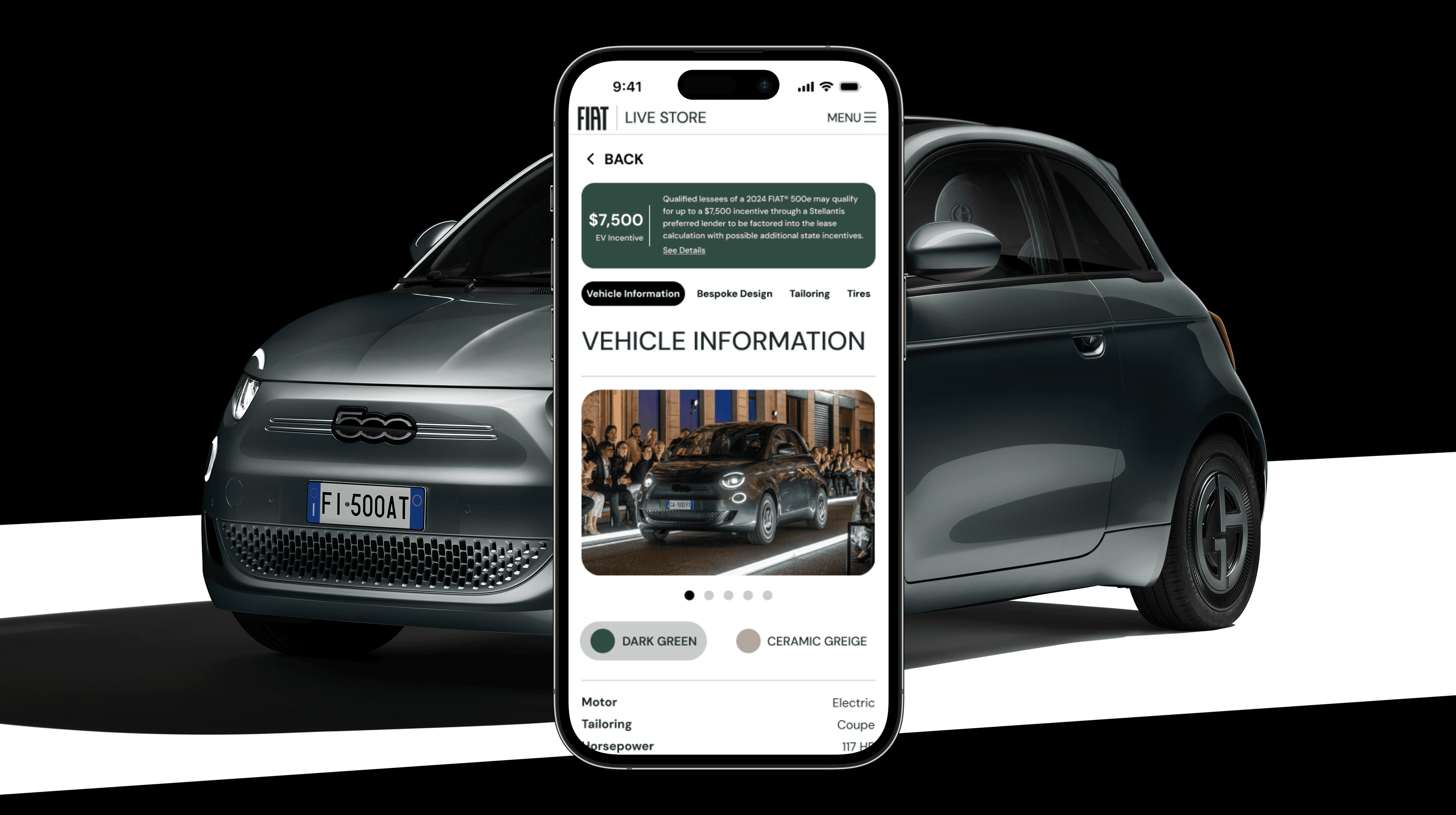 Following the announcement of the latest Fiat 500e Collector's Edition vehicle with Giorgio Armani, Fiat requested an overhaul of their virtual showroom, the place that buyers get connected with dealers to make their purchases. I was tasked with redesigning the landing page and delivering a UI overhaul.